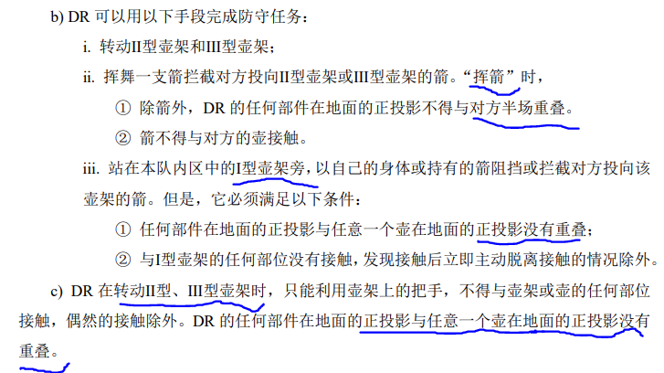 陆老师,您好!在规则2.4.2DR防守任务b)iii 和c)中明确提到防守I型壶和转筒时,DR机构正投影不得与桶重叠;但是在2.4.2DR防守任务b)ii挥箭的相关规则中,没有明确指出DR机构正投影不能和发生重叠,是否能够理解成:DR在挥箭时,允许DR机构与己方半场的桶(不论颜色)发生重叠?